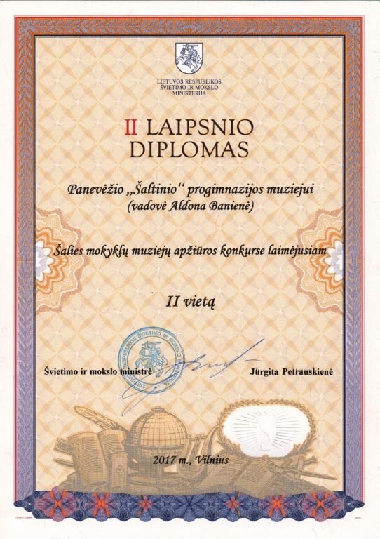 II laipsnio diplomas muziejaus vadovei Aldonai Banienei buvo įteiktas šalies mokyklų muziejų apžiūros konkurso respublikinėje konferencijoje „Projektinė ir edukacinė veikla mokyklos muziejuje“, kuri vyko 2017 m. lapkričio 22 d. Vilniuje, Lietuvos mokinių neformaliojo švietimo centre.