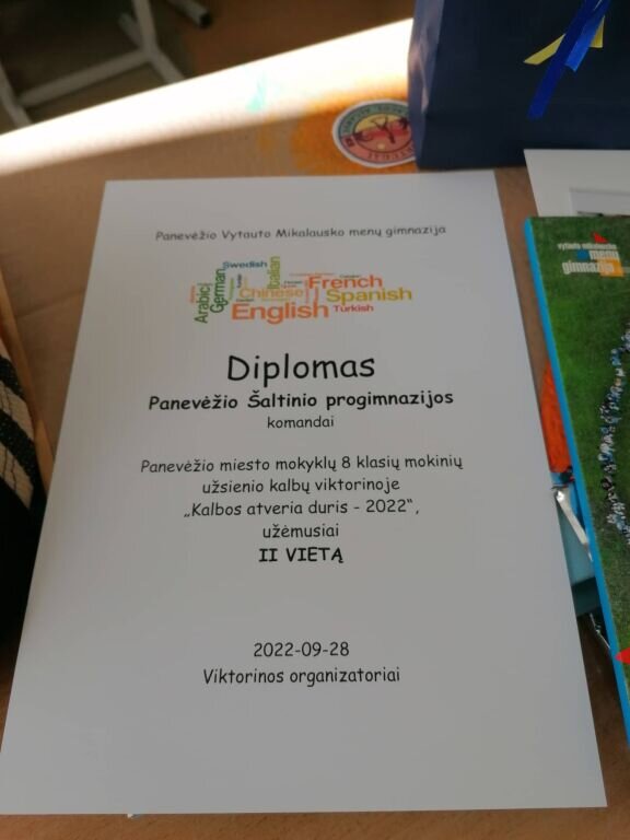 Markas Skrebys, Lukas Riauba, Rusnė Šimkevičiūtė ir Greta Staškūnaitė, 8b klasės mokiniai, Panevėžio miesto 8-ų klasių viktorinoje „Kalbos atveria duris", kuri 2022 m. rugsėjo 28 d. vyko Vytauto Mikalausko menų gimnazijoje, laimėjo II vietą. Mokinius rengė anglų kalbos mokytoja Ramūnė Žiūkienė.