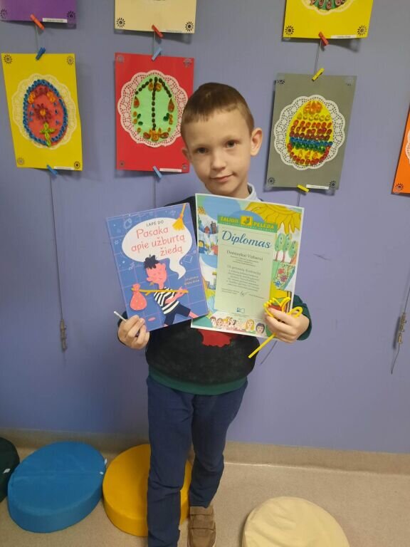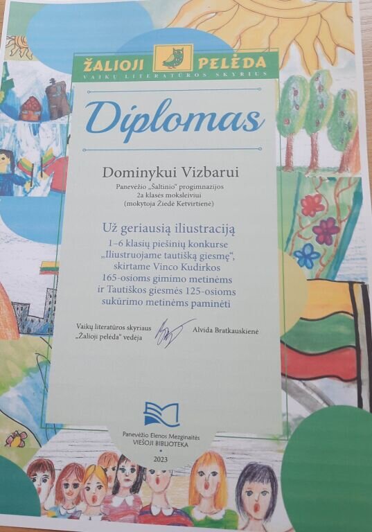 Dominykas Vizbaras, 2a klasės mokinys, Panevėžio E. Mezginaitės viešosios bibliotekos vaikų literatūros skyriaus „Žalioji pelėda“ organizuotame piešinių konkurse „Iliustruoju Tautišką giesmę“ laimėjo padėką už gražiausią iliustraciją antrų klasių mokinių tarpe (mokytoja Žiedė Ketvirtienė).