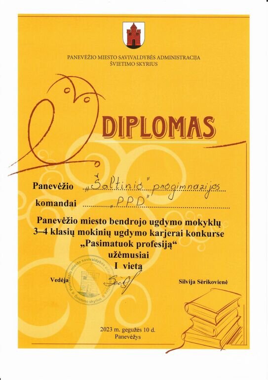 Klaudija Žandaraitė, 4c kl, Mantas Galvonas, 3b kl., Danielis Spudulis 4c kl., Gediminas Martinkėnas, 3b kl., progimnazijos mokinių komanda, Panevėžio miesto bendrojo ugdymo mokyklų 3–4 kl. mokinių ugdymo karjerai konkurse „Pasimatuok profesiją“, kuris 2023 m. gegužės 9 d. vyko „Saulėtekio“ progimnazijoje, laimėjo I vietą (pradinių klasių mokytojos Meilutė Greičiuvienė ir Janina Tubienė).