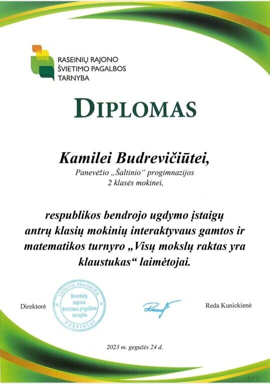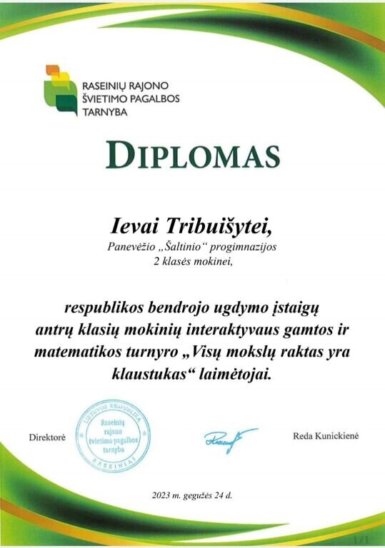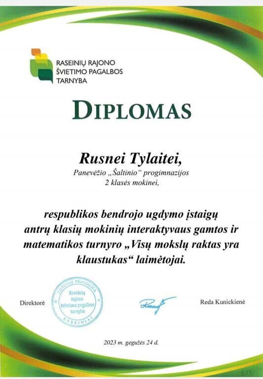 Rusnė Tylaitė, Ieva Tribuišytė, Kamilė Budrevičiūtė, Beatričė Jasiūnaitė, Austėja Puronaitė, 2a ir 2b klasių mokinės, tapo respublikos bendrojo ugdymo įstaigų antrų klasių mokinių interaktyvaus gamtos ir matematikos turnyro „Visų mokslų raktas yra klaustukas“, kurį organizavo Raseinių rajono švietimo pagalbos tarnyba, laimėtojomis (mokytojos Žiedė Ketvirtienė ir Geta Pečiulienė).