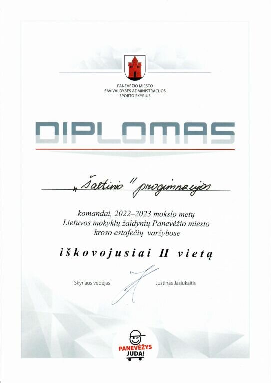2022–2023 mokslo metų Lietuvos mokyklų žaidynių Panevėžio miesto kroso estafečių varžybose mokyklos komanda iškovojo II vietą (fizinio ugdymo mokytoja Vesta Ilgūnaitė):