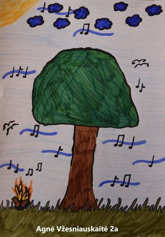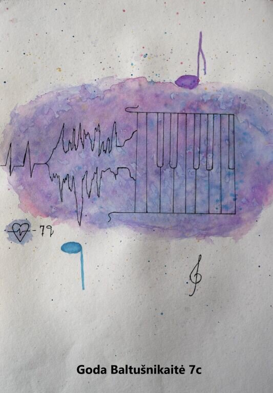 Piešiniai 2023 m. respublikiniam mokinių piešinių konkursui „Matau muziką“, kuris skirtas Europos muzikos dienai mokykloje (EuDaMuS) paminėti. Konkurse mokinius dalyvauti paskatino muzikos mokytoja Lina Skyrienė. Herkaus Mockūno, 1c klasės mokinio, darbas (pirmas iš kairės) laimėjo nominaciją „Už meninės raiškos savitumą“.
