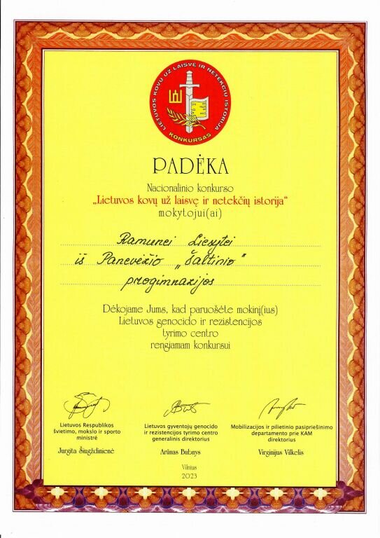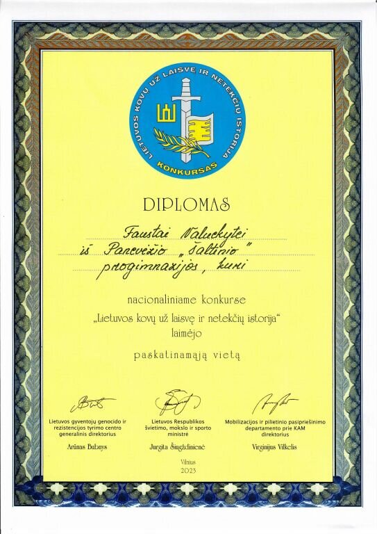 Fausta Valuckytė, 7c klasės mokinė, tapo 2022–2023 m. konkurso „Lietuvos kovų už laisvę ir netekčių istorija“, kurį organizuoja Lietuvos gyventojų genocido ir rezistencijos tyrimų centras, Paskatinamosios vietos laimėtoja. Piešinys – „Šviesa tamsoje“. Konkurse mokinę paskatino dalyvauti istorijos mokytoja Ramunė Liesytė.