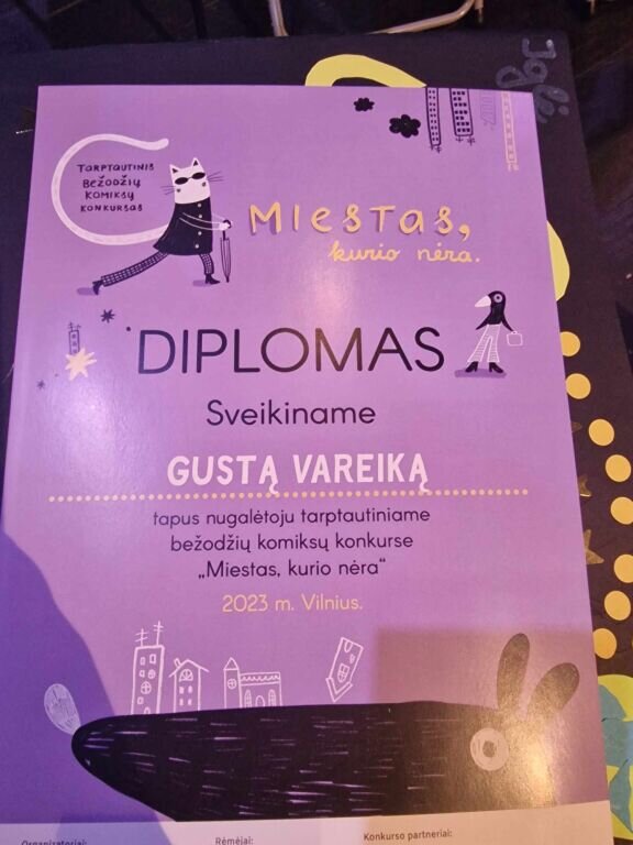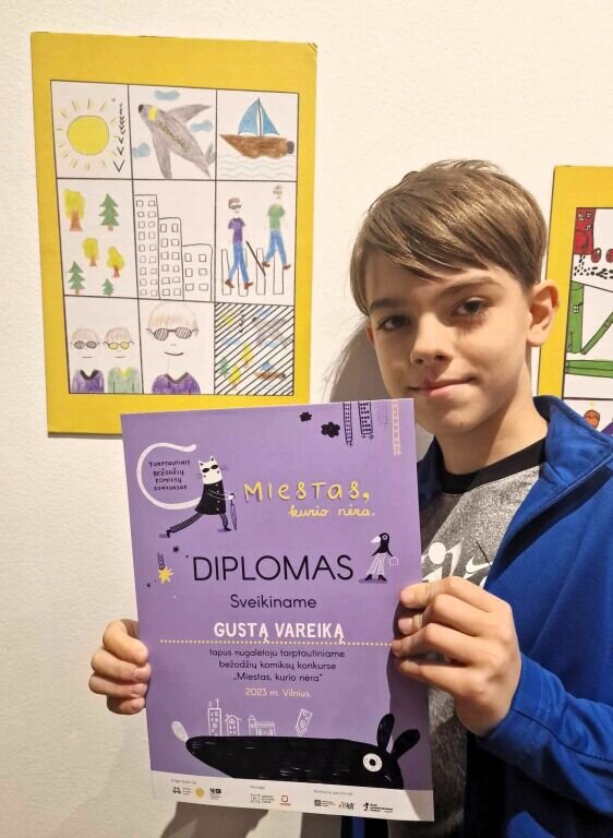 Gustas Vareika, 5a klasės mokinys, tapo tarptautinio bežodžių komiksų konkurso „Miestas, kurio nėra“ vienu iš 12 nugalėtojų. Konkursas sulaukė daugiau nei 400 darbų iš visų Baltijos šalių. 2023 m. lapkričio 18 d. „Vaikų Knygų Saloje“ Gustas buvo apdovanotas ir galėjo pasidalinti savo mintimis šia tema. Organizatoriai paminėjo, kad ypač susidomėjo jo darbo idėja. Gustą konkurse dalyvauti paskatino lietuvių kalbos mokytoja Ernesta Kriaučiūnienė.