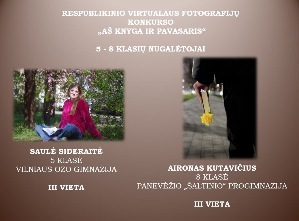 Aironas Kutavičius, 8b klasės mokinys, Lietuvos mokyklų bibliotekų darbuotojų asociacijos (LMBDA) organizuotame respublikiniame virtualiame fotografijų konkurse „Aš, knyga ir pavasaris“, 5–8 klasių grupėje, užėmė III vietą.