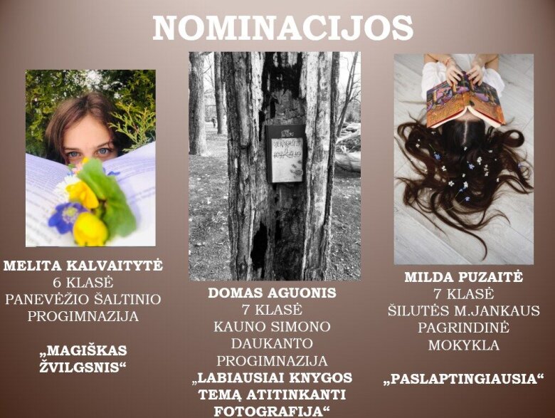 Melitos Kalvaitytės, 6c klasės mokinės, daryta nuotrauka Lietuvos mokyklų bibliotekų darbuotojų asociacijos (LMBDA) organizuotame respublikiniame virtualiame fotografijų konkurse „Aš, knyga ir pavasaris“ pelnė nominaciją „Magiškas žvilgsnis“.