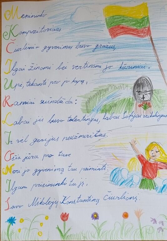 Beatričė Jasiūnaitė, 4b klasės mokinė, Tarptautiniame nuotoliniame 4 klasių lietuvių kalbos konkurse-viktorinoje „KALBA YRA MŪSŲ TAUTA... KALBA ESAME MES“, skirtame Mikalojaus Konstantino Čiurlionio 150-osioms gimimo metinėms, laimėjo I vietą. Mokytoja Geta Pečiulienė. Konkursą organizavo Erudito licėjus. Mokinė turėjo parengti namų darbą – akrostichą „ČIURLIONIS“. Dalyviams buvo parengtos įdomios ir įtraukios užduotys, kurias atlikdami pademonstravo ir praplėtė savo krašto pažinimo, gimtosios kalbos (gramatikos, teksto suvokimo) žinias, gebėjimus bei literatūrinę patirtį.