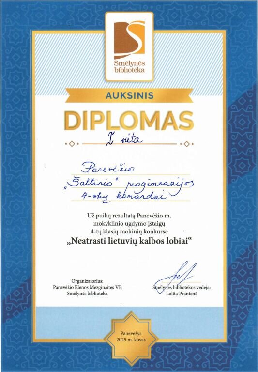 Ugnė Lukoševičiūtė, 4b kl., Domas Jeremičas, 4c kl., Beatričė Jasiūnaitė, 4b kl., Kajus Čielis, 4a kl. ir Rusnė Tylaitė, 4a kl., progimnazijos mokinių komanda, Panevėžio mokyklinio ugdymo įstaigų 4-ų klasių mokinių konkurse „Neatrasti lietuvių kalbos lobiai“, kurį 2025-03-20 organizavo Panevėžio Elenos Mezginaitės VB Smėlynės biblioteka, laimėjo I vietą. Mokytojos Žiedė Ketvirtienė, Geta Pečiulienė, Danguolė Pinkevičienė.