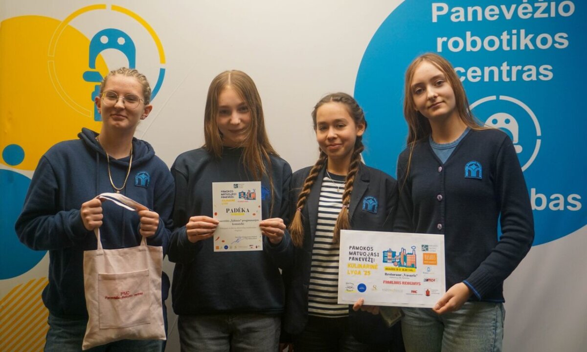 Monika Janušaitė, Sofija Šmakotinaitė, Luknė Trumpickaitė, Viltė Vasiliauskaitė, 8a klasės mokinės, kovo 18 dieną atrankiniame renginyje „Pamokos matuojasi Panevėžį: Kulinarinė lyga“, kuris vyko robotikos centre „RoboLabas“, užėmė I vietą ir pateko į finalą. Ugdymo karjerai mokytoja Rita Paurazienė.