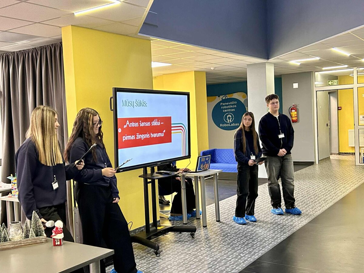 Panevėžio „Šaltinio“ progimnazijos bendruomenė sėkmingai priėmė UAB Panevėžio stiklas mestą iššūkį dalyvauti iniciatyvoje „Pamokos matuojasi Panevėžį“. 8a klasės komanda: Emilija Maknevičiūtė, Kornelija Merkytė, Patricija Pakalnytė, Benas Skrebys, kūrybiškai ir atsakingai sprendė, kaip skatinti tvarų vartojimą mokykloje ir už jos ribų.
