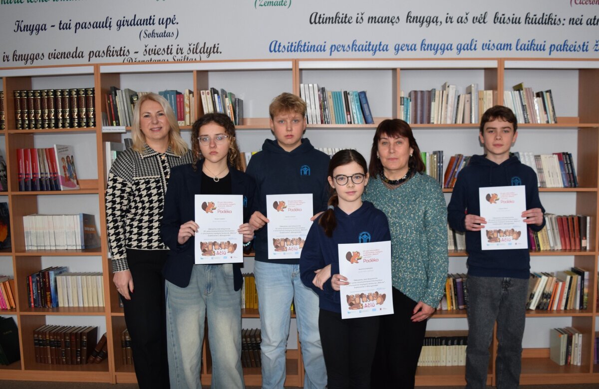 Progimnazijos direktorė Zina Stripeikienė ir informacinių technologijų mokytoja Audronė Sruogienė pasveikino 1–8 klasių mokinius, kurie informatikos ir informatinio mąstymo konkurse „Bebras“ Panevėžio miesto savivaldybėje pateko į dešimtuką: