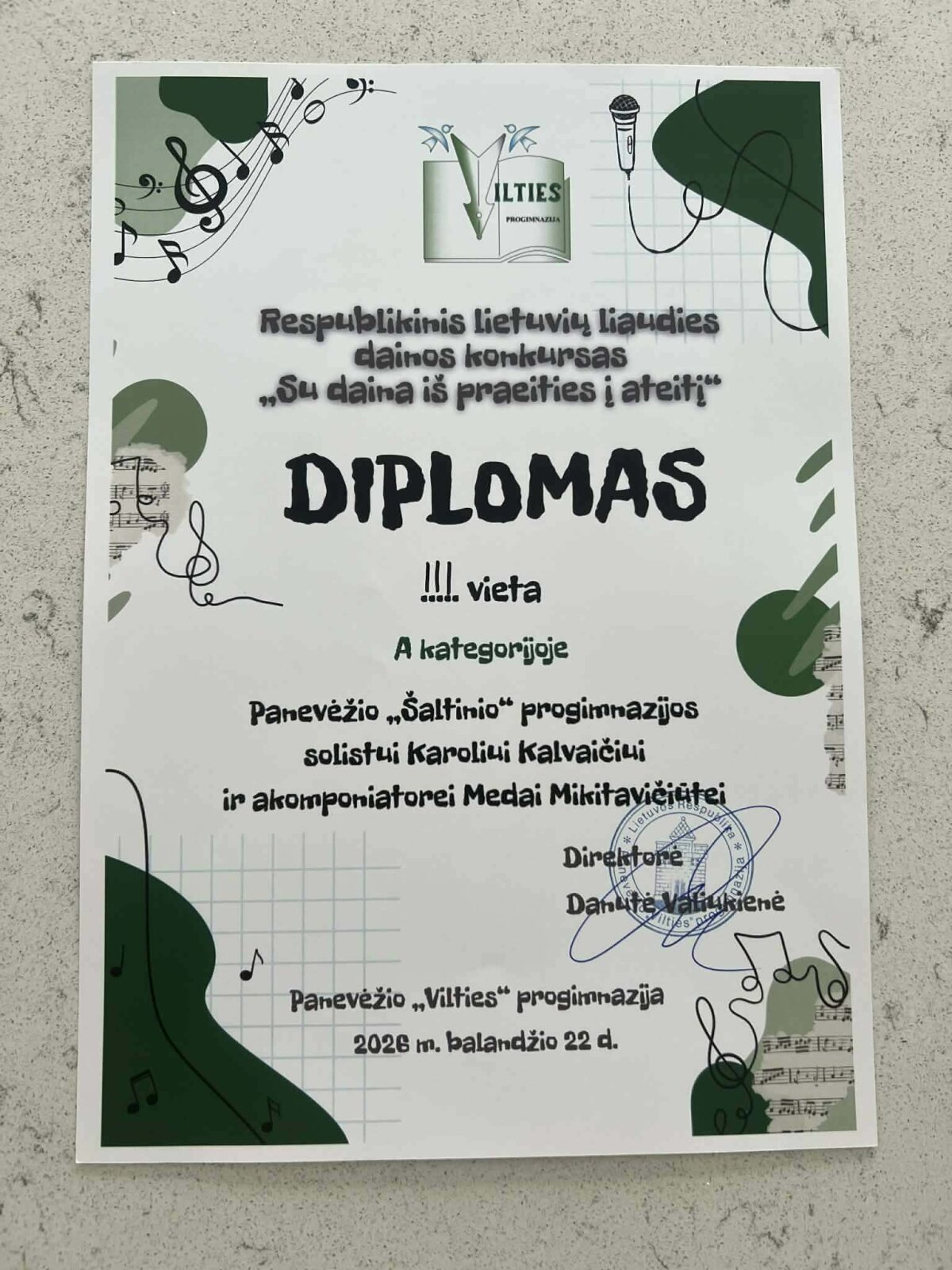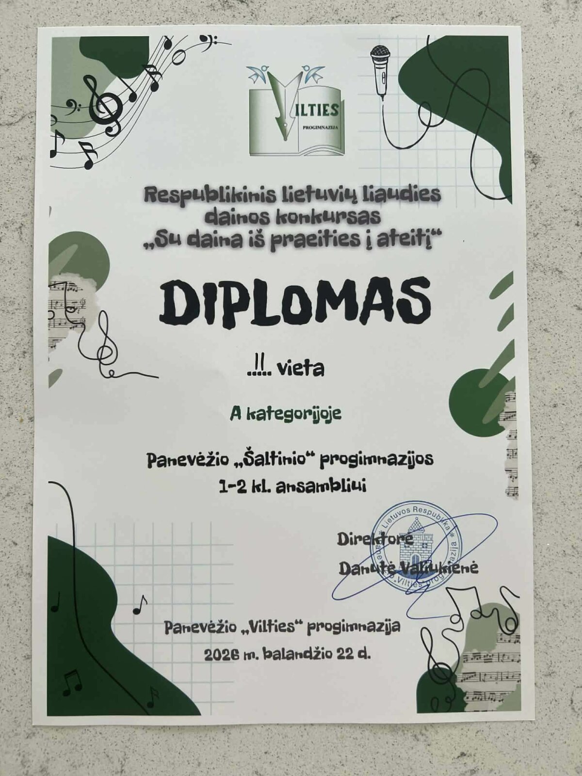 Respublikiniame lietuvių liaudies dainos konkurse „Su daina iš praeities į ateitį“ 1–2 klasių mokinių ansamblis, kuriam vadovauja muzikos mokytoja Lina Skyrienė, užėmė II vietą. 3c klasės mokinys Karolis Kalvaitis ir akompaniatorė Meda Mikitavičiūtė, kuriuos ruošė muzikos mokytoja Odeta Ratkevičienė, pelnė III vietą.
