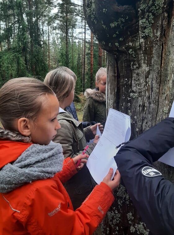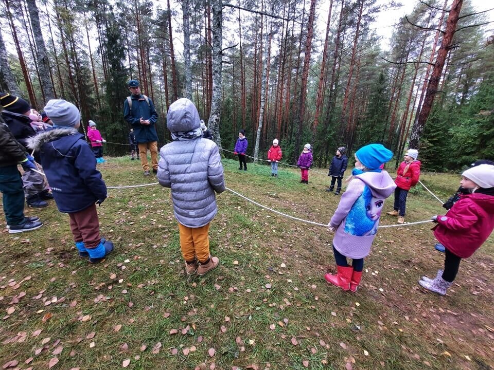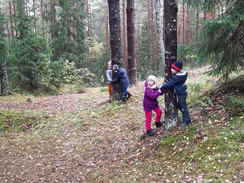 O kartu su savo mokytojomis vaikai miške ieškojo konkrečių medžių, atpažino jų kaimynus, ieškojo medžių vaisių, darė medžių žievės atspaudus, išsiaiškino, kas sudaro miško paklotę.