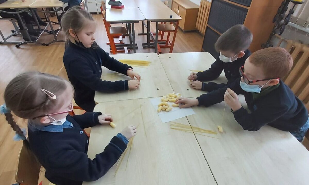 Būrelio „Mažieji atradėja“ dalyviai poromis ir po vieną kūrė statinius iš makaronų bei kukurūzų. Statiniai buvo ne tik pastatyti, bet ir išmatuoti, duomenys užfiksuoti.