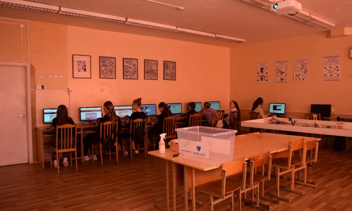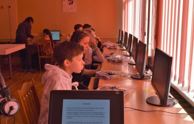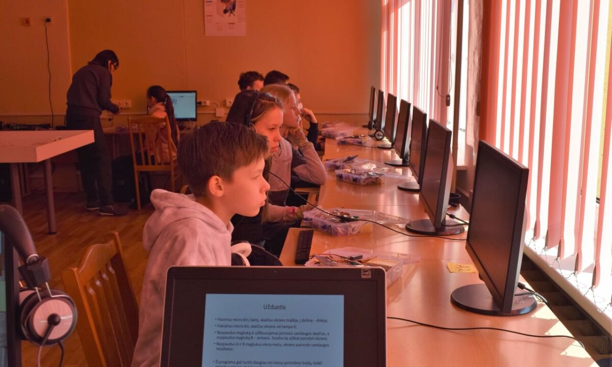 Informatikos kabinete kartu su mokytoja Audrone mokiniai, susipažinę su Micro:bit kompiuteriuku, kūrė programą „Skaičiuotuvas“, kuri atlieka aritmetinius veiksmus su sveikaisiais skaičiais ir ją išbandė Micro:bit kompiuteriuke.