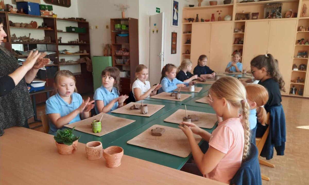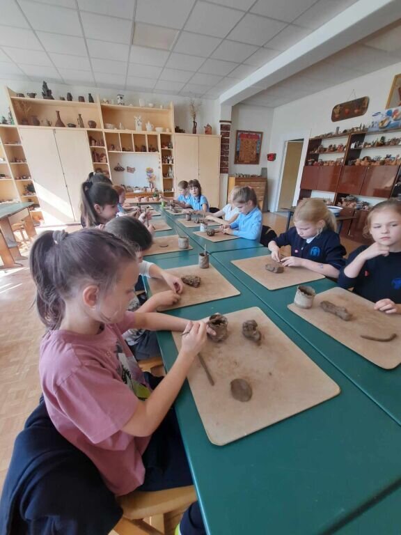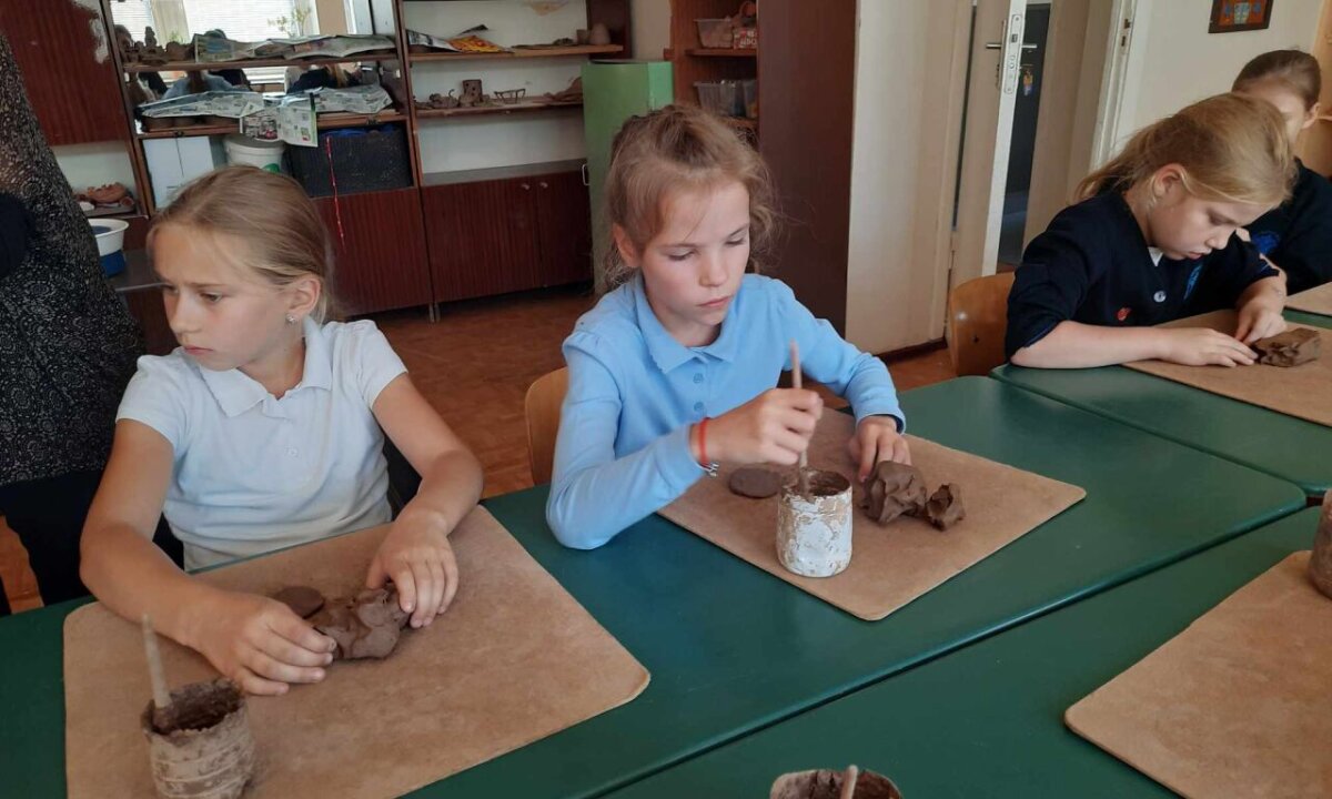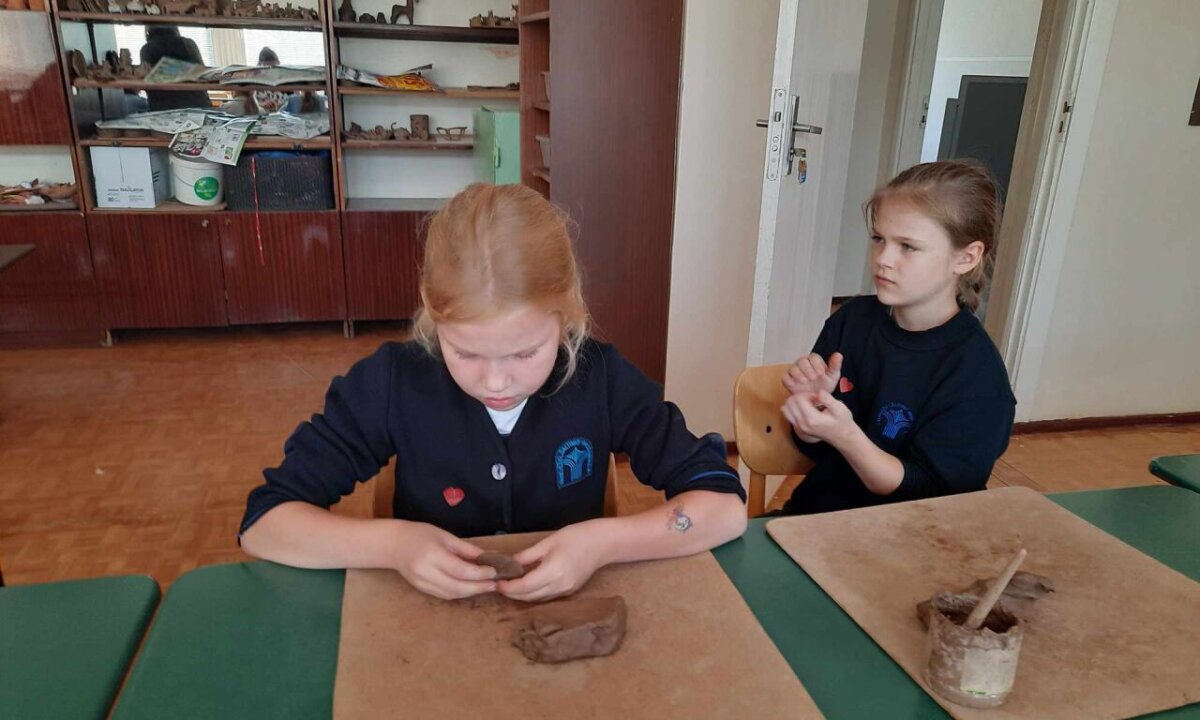 Mergaitės noriai darbavosi su moliu. Minkė, suko, klijavo, puošė. Mergaitės sukūrė gražias molines vazeles.