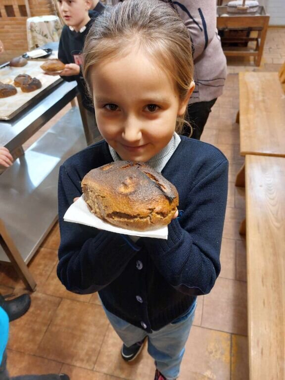 Lapkričio 23 d. 2a klasės mokiniai vyko į Radviliškių kaimo kepyklą. Edukacinio užsiėmimo metu vaikai susipažino su senaisiais darbo įrankiais: grūdų kuliamąja – spragilu, grūdų malimo įrankiu – akmeninėmis girnomis, miltų sijojimo įrankiu ir t.t. Mokiniai turėjo galimybę ne tik stebėti duonos „gimimo“ procesą, bet ir patys susiformuoti savo duonos kepalėlį. Kol duona kepė, vaikai susipažino su ilgu duonos keliu, pavaizduotu sodyboje pastatytame skulptūrų ansamblyje, vaizduojančiame visus darbus, kol duonelė pasiekia stalą, klausėsi pasakos apie Vilką, kuris nepanoro kepti duonos, minė mįsles apie duoną, klausėsi pasakojimų apie valstiečių buityje gyvenusias duonos tradicijas, papročius ir ritualus. Grįžę į mokyklą, vaikai spėjo, kiek galėtų sverti iškeptas duonos kepaliukas. Vėliau kepaliukus pasvėrė, parsinešę namo kartu su savo artimaisiais skaniai suvalgė.