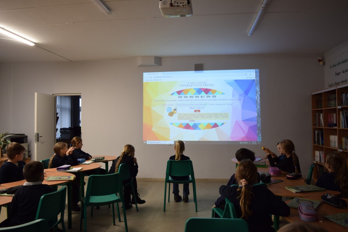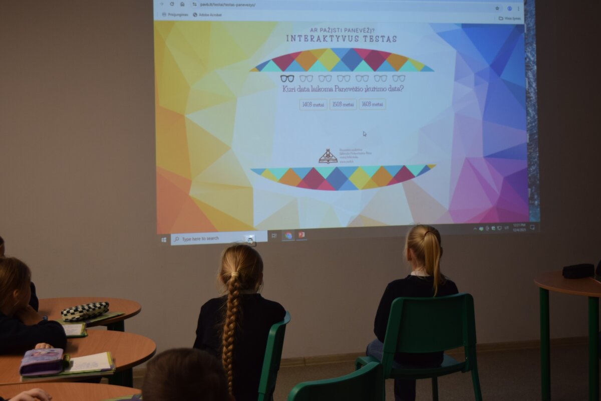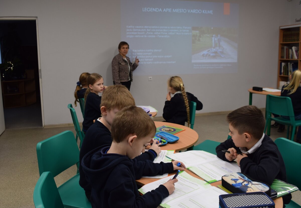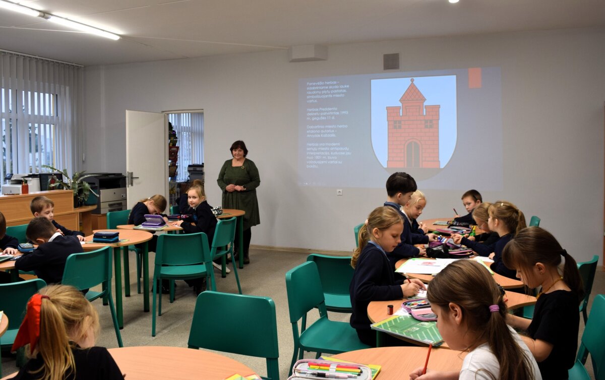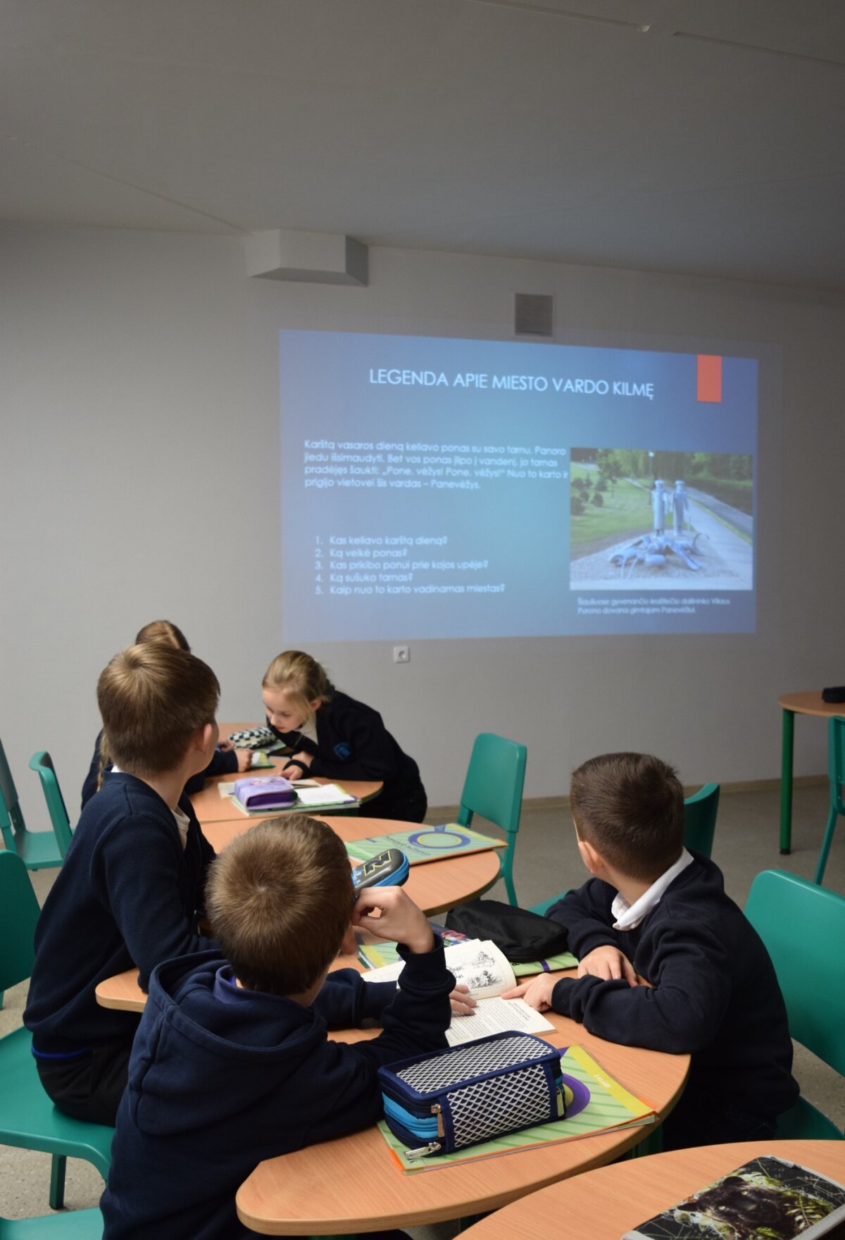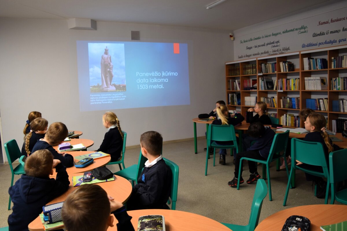 2b klasės mokiniams gruodžio 4 d. vyko integruota visuomeninio ugdymo ir skaitymo skatinimo pamoka „Mano gyvenamosios vietovės istorija“ mokyklos bibliotekoje. Bibliotekininkė ir kraštotyrininkų būrelio vadovė Aldona Banienė mokiniams išaiškino, kas yra kraštotyra ir kraštotyrininkas. Antrokai skaitė legendą apie miesto vardo kilmę, ją atpasakojo, sužinojo kelintais metais rašytiniuose šaltiniuose pirmą kartą paminėtas Panevėžio vardas, susipažino su seniausia miesto gatve, seniausiu pastatu, aukščiausiu statiniu. Noriai atsakė į interaktyvaus testo „Ar pažįsti Panevėžį“, kurį sukūrė Panevėžio apskrities Gabrielės Petkevičaitės-Bitės viešoji biblioteka, klausimus. Mokiniai aptarė miesto herbo spalvas, formą ir jį nuspalvino. Antrokams labai patiko Panevėžio vardo kilmės legenda, kurią pažadėjo papasakoti tėveliams.