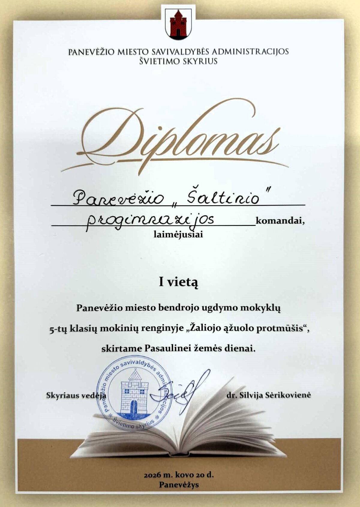 Žemės dienos minėjimo proga Panevėžio „Ąžuolo“ progimnazijoje 2026 m. kovo 20 d. vyko konkursas „Žaliojo ąžuolo protmūšis“. Mūsų progimnazijos 5-ų klasių mokinių komanda: Austėja Puronaitė (5b), Beatričė Jasiūnaitė (5b), Marija Atraškevičiūtė (5c) ir Domas Jeremičas (5c), pasiekė puikų rezultatą – iškovojo I vietą! Konkursui mokinius paruošė mokytoja Ligita Urbonienė. Sveikiname!