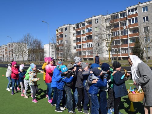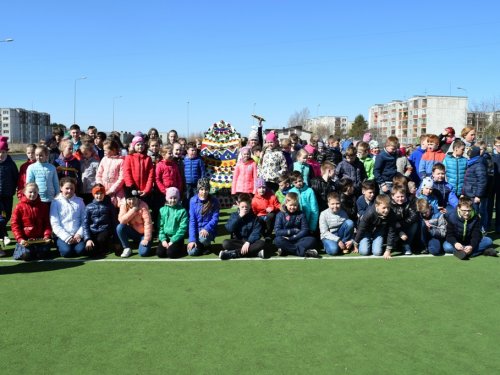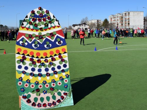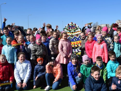 Kai pagaliau milžiniškas margutis buvo baigtas, į mokyklos stadioną pradinių klasių mokinius balandžio 11 dieną pakvietė Velykų bobutė ir Velykų zuikis. Jie surengė vaikams nuotaikingas estafetes. Už vaikų pastangas ir triūsą buvo atlyginta. Kiekvienai klasei įteiktas saldainis-siurprizas.