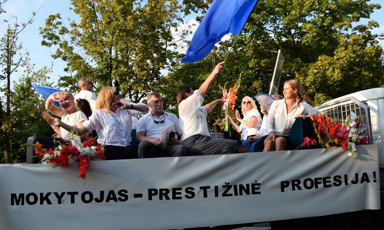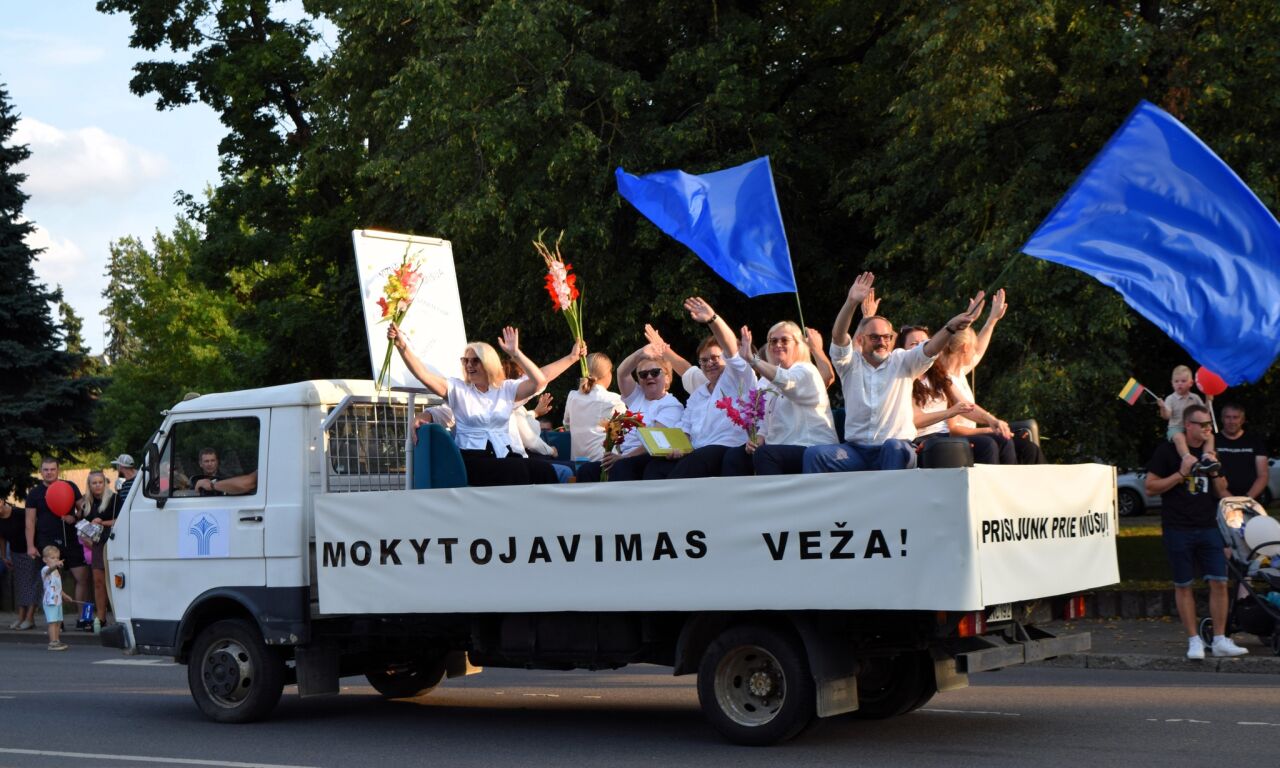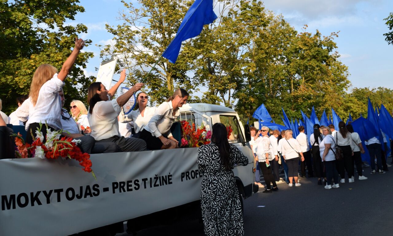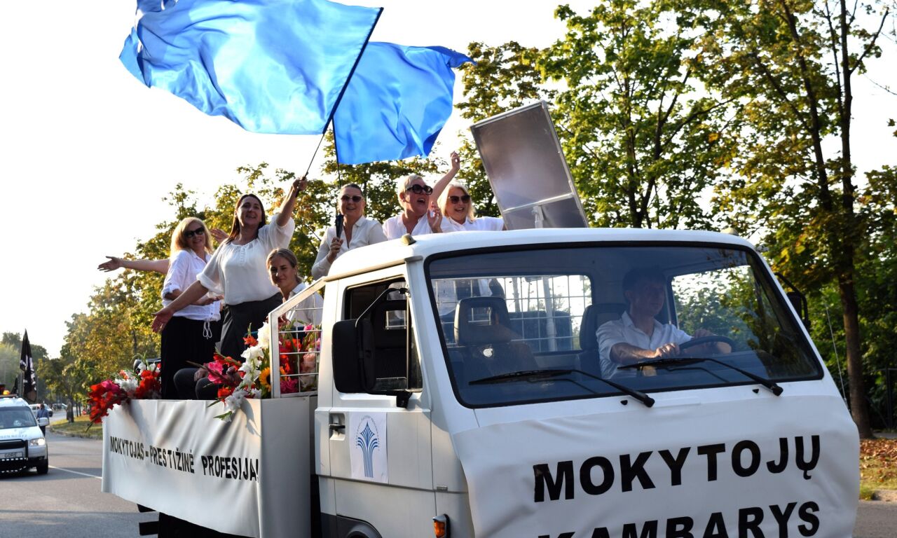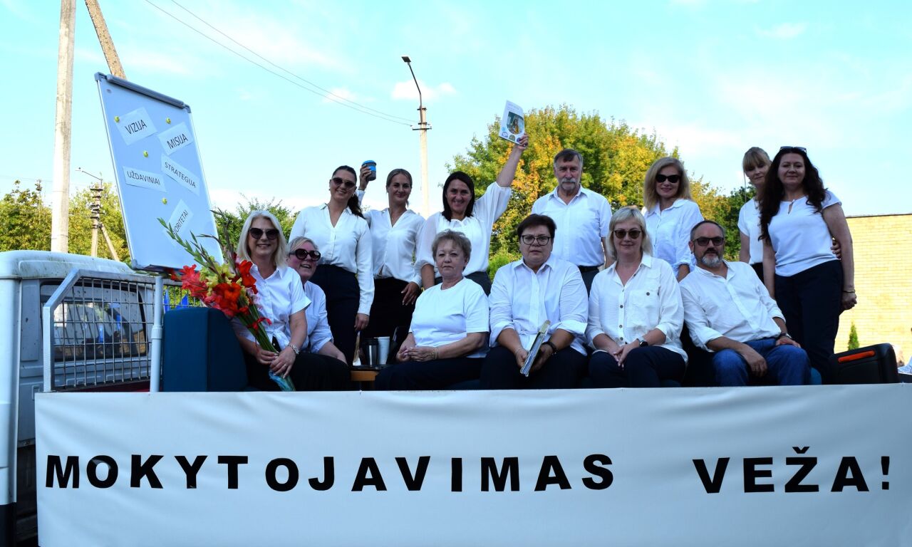 Mūsų progimnazijos komanda išsiskyrė mėlynų vėliavų jūra ir transporto priemone, vežusia „Mokytojų kambarį“, kuriame sėdėjo, dainavo, mojavo miestiečiams, dalino gėles ir kvietė prisijungti prie pedagogų bendruomenės mokyklos direktorė Zina Stripeikienė, lietuvių, užsienio kalbų, istorijos, geografijos, pradinio ugdymo, matematikos, fizinio ugdymo, dorinio ugdymo, muzikos mokytojai. Mašinos šonuose puikavosi lozungai: „Mokytojavimas veža!“, „Prisijunk prie mūsų!“, „Mokytojas – prestižinė profesija“. Šiais metais eisena žygiavo nauju maršrutu palei Nevėžio upę: Nemuno g., Taikos al., Stoties, Jakšto, Smėlynės, Elektros, Vasario 16-osios g. Visur šaltiniečius lydėjo šiltos žiūrovų šypsenos, aplodismentai, pritarimai dainai ir draugiški rankų pamojavimai, atpažinus mylimus mokytojus.
