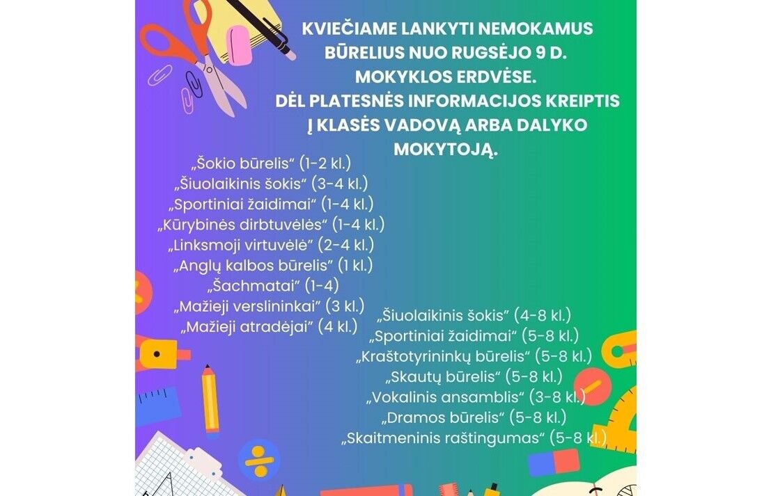 - Norėdami užtikrinti visokeriopą mokinių ugdymąsi teikiame galimybes miesto neformalaus švietimo tiekėjams organizuoti būrelius progimnazijos erdvėse individualiai derinant priėmimo procedūras.