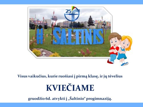 Visus vaikučius, kurie ruošiasi į pirmą klasę, ir jų tėvelius kviečiame gruodžio 6 d. atvykti į „Šaltinio“ progimnaziją. Čia Jūs susipažinsite su būsimomis mokytojomis, mokykla, vieni su kitais.