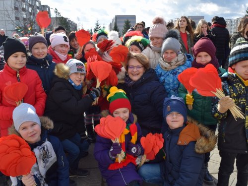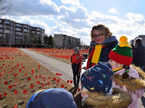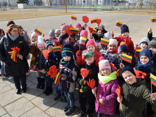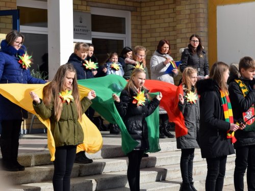 Vidurdienį vaikai ir mokytojai, tėveliai su trispalviais atributais: vėliavėlėmis, kepurėmis, šalikais, pintomis juostelėmis, ženklais atlape, išėjo į kiemą. Plevėsavo ir didelės iš namų atsineštos vėliavos. Mokiniai glaudė prie savęs raudonas širdeles. Nuskambėjus Lietuvos himnui, šoko šiuolaikinio šokio grupė „Action“, dainą „Yra šalis – Lietuva“ dainavo 6-ų klasių mergaitės. Mokyklos direktorė Zina Stripeikienė pasveikino progimnazijos nuotraukų konkurse „Kaip mano šeima švenčia Vasario 16-ąją?“ dalyvavusius mokinius: 1a klasės mokinį Elijų Petrauską ir 2b klasės mokinį Luką Čeponį. Jiems buvo įteikti padėkos raštai ir trispalviai šalikai. Po šventinio paminėjimo mokiniai pievelėje priešais mokyklą „prisodino“ raudonų širdelių ir susikibę už rankų apjuosė visą raudonuojantį plotą. Eidami ratu, šaltiniečiai skandavo: „Šaltinis myli Lietuvą!“