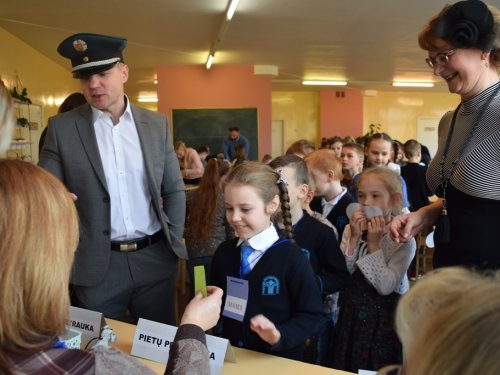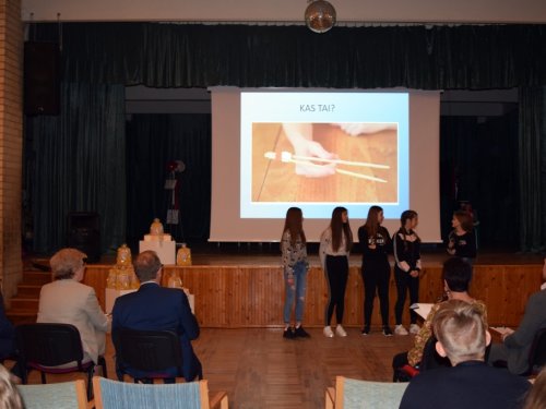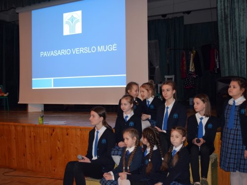Galiausiai aktų salėje buvo pristatomos verslo idėjos, sukurtos 5–8 klasių mokinių. O vertino jas ir pirko tikri verslininkai: R. Serva, Panevėžio krašto pramonininkų asociacijos vadovas, A. Žiaunienė, Panevėžio verslo centro direktorė, S. Ramoškevičius, pardavimų vadybininkas, T. Anilionis, Panevėžio Margaritos Rimkevičaitės paslaugų ir verslo mokyklos direktorius, I. Grigaitė, edukacinio pobūdžio šeimos studijos „Smalsučiai“ įkūrėja ir vadovė, bei L. Sacevičius, maitinimo įmonių kokybės ir pardavimų konsultantas. Visi garbingi svečiai idėjų sumanytojams pateikė suktus ir rimtus klausimus, į kuriuos mokiniai atsakinėjo labai atsakingai. Idėjų būta įvairių: pasiūlyta įsigyti išmaniąją lovą, kuri pati pasikloja, išmaniąją kepurę, išmaniuosius batus, įspėsiančius apie kliūtį kelyje, prekių vežimėlį su GPS. Susirinkusiems labai patiko išmanioji lazdelė, padėsianti nustatyti maisto sudėtį ir suskaičiuosianti kalorijas, mobili kuprinė, kuri keliaus iš paskos, sujungtos kiniškos lazdelės. Pačia pačiausia verslo idėja išrinktas 8a klasės pristatytas „Stresicidis“, stresą mažinantis aparatas. Idėjas pasiūliusieji buvo apdovanoti dovanėlėmis. Mokyklos direktorė Z. Stripeikienė padėkojo visiems dalyvavusiems, kūrusiems, visoms mokytojoms, be kurių pagalbos neapsiėjo nei vienos klasės mokiniai. Svečias T. Anilionis palinkėjo būtinai siekti savo tikslų, idėjas įgyvendinti realybėje, o jei nepasiseks, nenukabinti nosies ir atvykti mokytis verslo paslapčių į Panevėžio Margaritos Rimkevičaitės paslaugų ir verslo mokyklą.