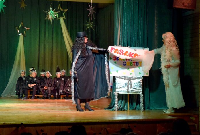 Du vakarus, gruodžio 17 ir 18 dienomis, pradinių klasių mokiniai vaidino kalėdiniame muzikiniame spektaklyje „Pasakų knygą atvertus“. Per stebuklingas pasakų karalystes keliavo baltoji (mokytoja Snaigė Varanauskienė) ir juodoji (mokytoja Vida Baronienė) fėjos, Gretutė (Ugnė, 2b kl.), Jonukas (Benas, 2a kl.), Paukštelis (Deividas, 2c kl.) ir elfai (2-ų klasių mokiniai). 1a ir 4c klasių mokiniai vaidino ir šoko pasakoje „Kupriukas muzikantas“, 1b, 1c – „Katinėlis ir gaidelis“, 3a, 3b – „Vilkai ir ožiukai“, 4a, 4b – „Coliukė“. Spektaklio kūrėjai dovanojo puikią kalėdinę nuotaiką.