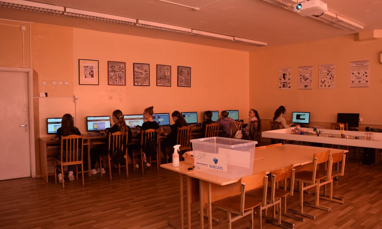 Antrąją dieną veiklos vyko mokykloje. Stovyklautojai mokėsi programuoti „Microbit“, dėliojo tangramas, žaidė kompiuterinį žaidimą, skirtą išmokti saugiai elgtis internete.